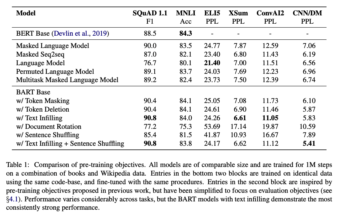 - With the exception of ELI5, BART models using text-infilling perform well on all tasks.