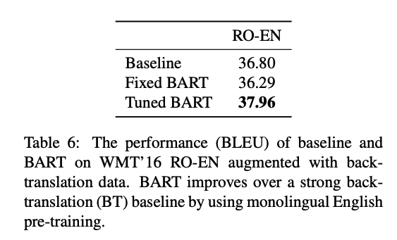 - These layers are trained to essentially translate the foreign language to noised English, by propagation through BART, thereby using BART as a pre-trained target-side language model. This approach improves performance over a strong back-translation MT baseline by 1.1 BLEU on the WMT Romanian-English benchmark