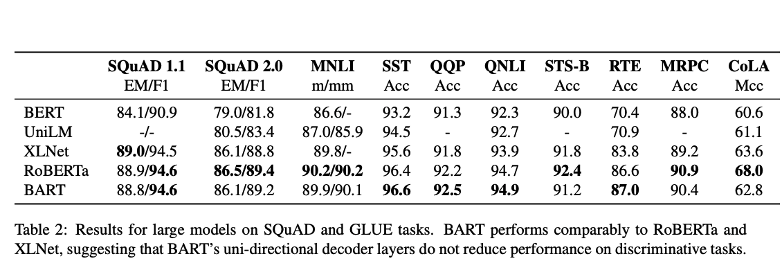 - Suggesting that BART’s improvements on generation tasks do not come at the expense of classification performance.