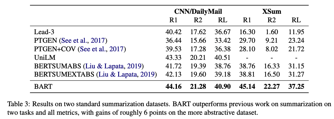 - Summaries in the CNN/DailyMail tend to resemble source sentences. Extractive models do well here, and even the baseline of the first-three source sentences is highly competitive. Nevertheless, BART outperforms all existing work.