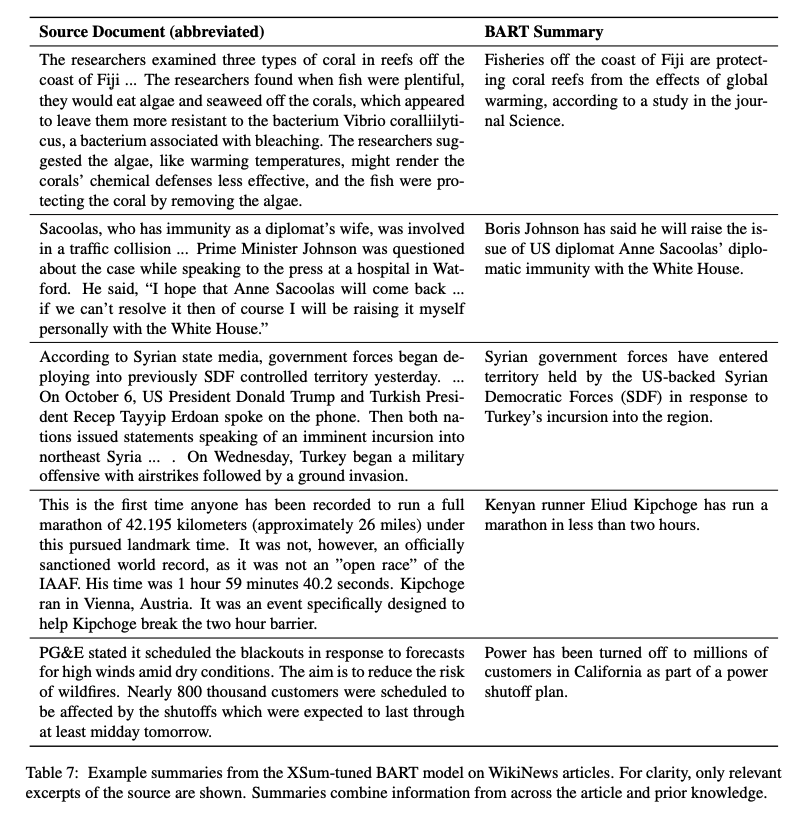 - These samples demonstrate that the BART pretraining has learned a strong combination of natural language understanding and generation.