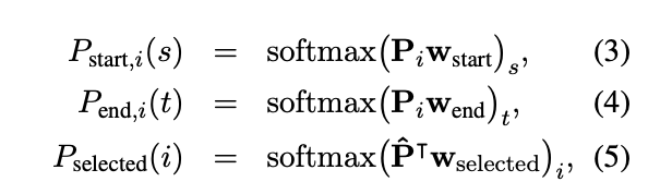 - ) where Pˆ = [P [CLS] 1 , . . . , P [CLS] k ] ∈ R h×k and wstart, wend, wselected ∈ R h are learnable vectors. We compute a span score of the s-th to t-th words from the i-th passage as Pstart,i(s) × Pend,i(t), and a passage selection score of the i-th passage as Pselected(