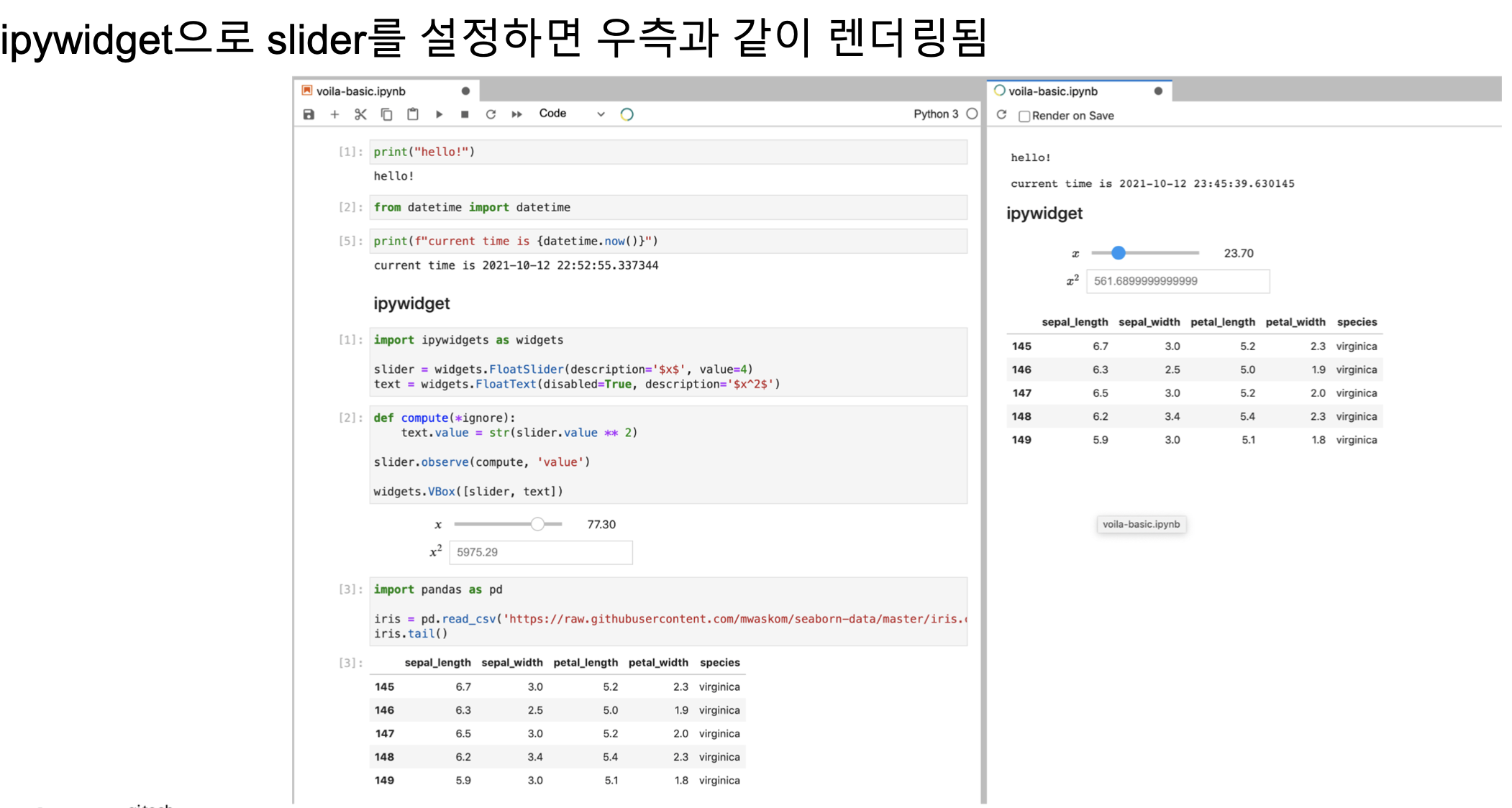- ipywidget에서 Voila를 클릭하면 렌더링이 된 화면을 볼 수 있음