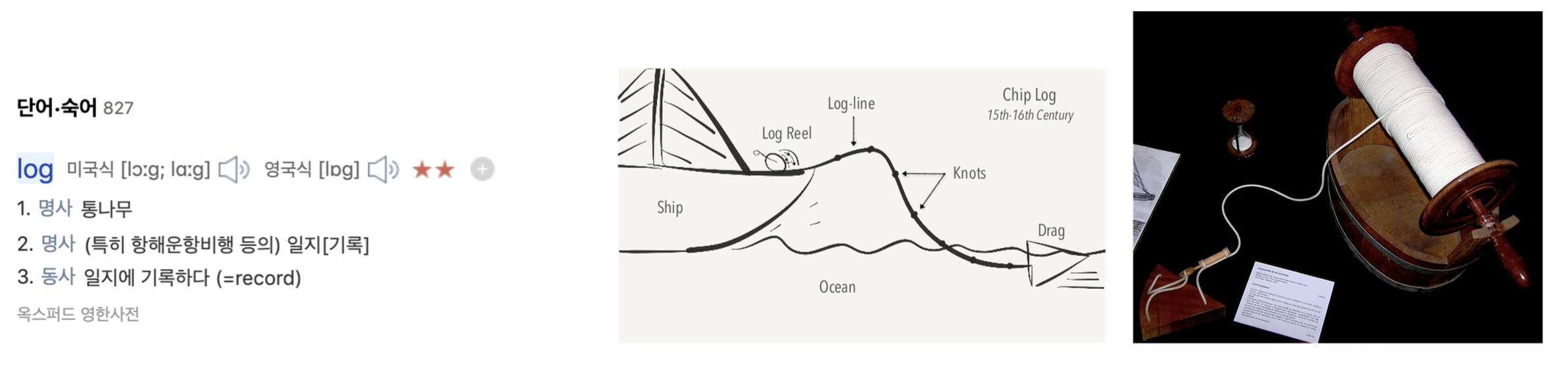 - 배의 앞에서 통나무를 띄워서 배의 선미까지 도달하는 시간을 재는 방식에 로그를 사용