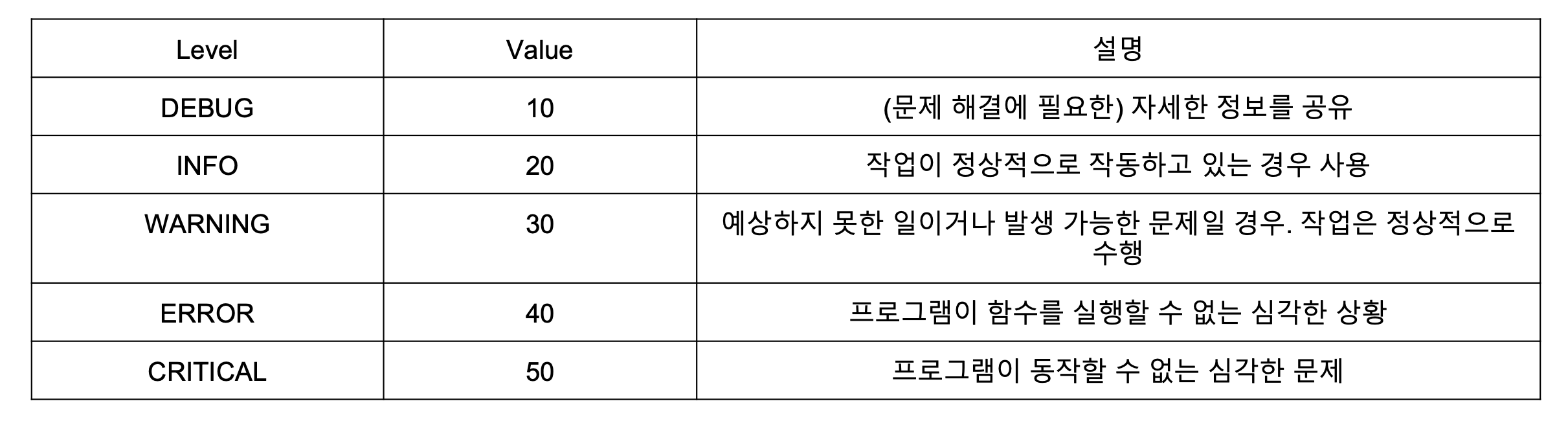 - logging.setLevel() : Logger에서 사용할 Level 지정
