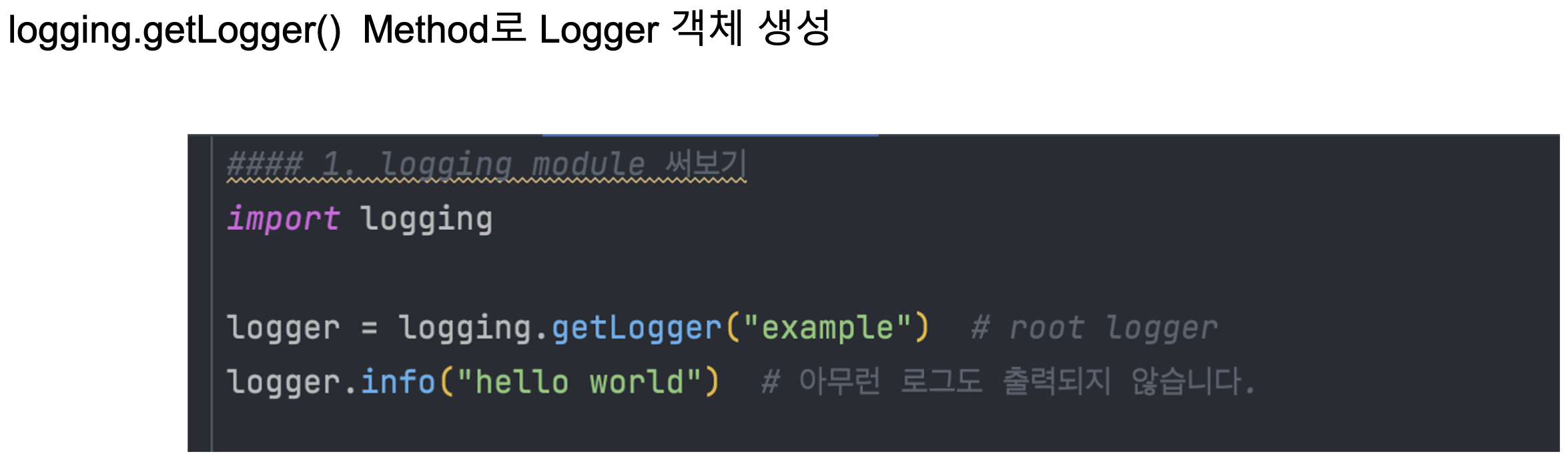 - logging.getLogger(‘foo.bar’) => logging.getLogger(‘foo’)의 자식 logger 반환