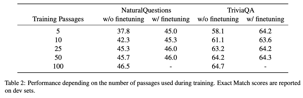 - 각기 다른 훈련 passage 개수로 훈련을 시도하고, test 시에만 100개의 passage를 사용