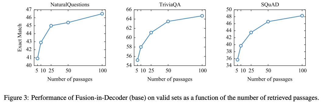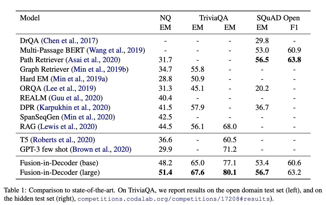 - Fusion-in-Decoder가 NaturalQuestion and TriviaQA benchmarks에서 이전 것들을 성능이 좋음